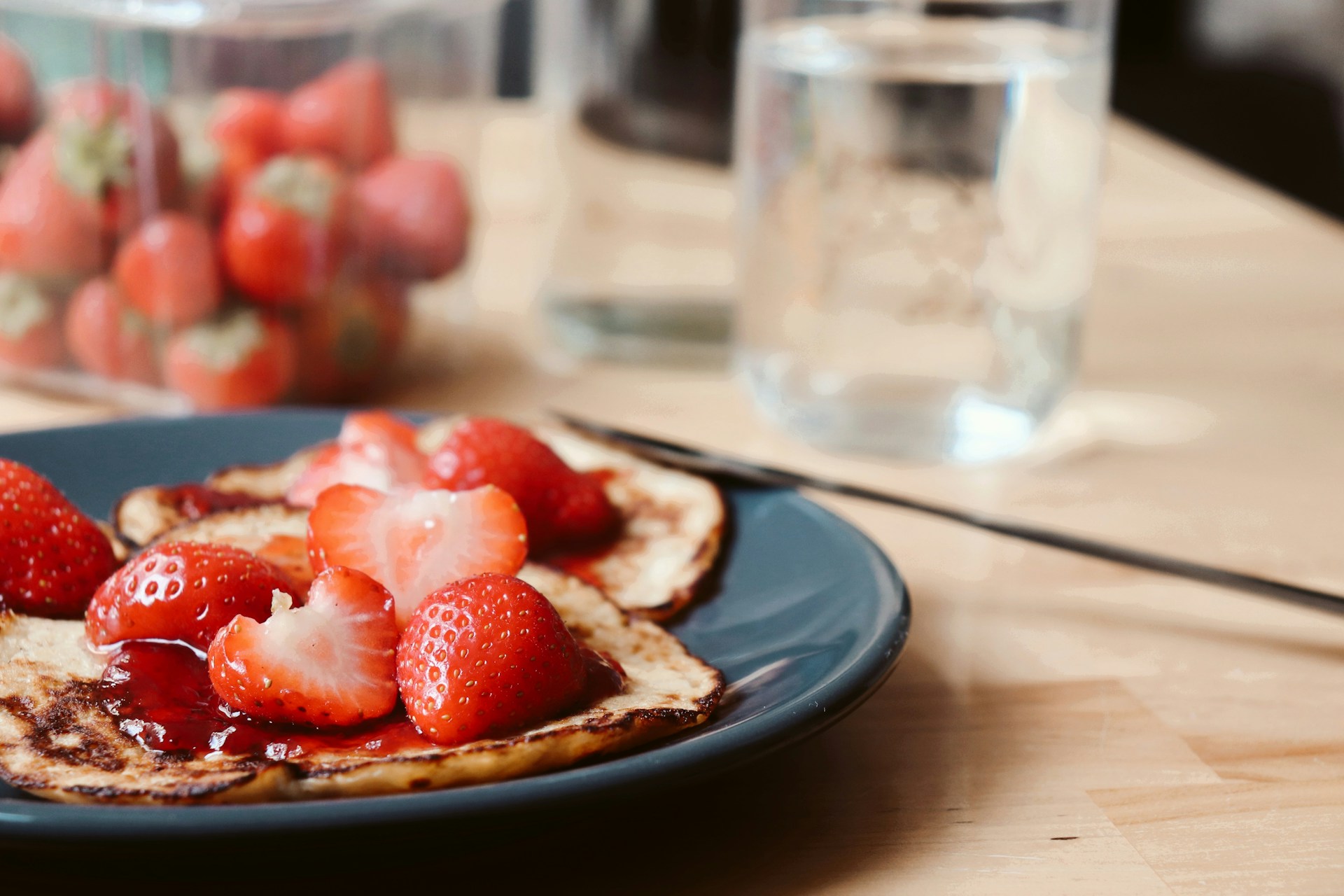- Usmażone naleśniki możesz podawać od razu, polewając je ciepłym sosem truskawkowym.